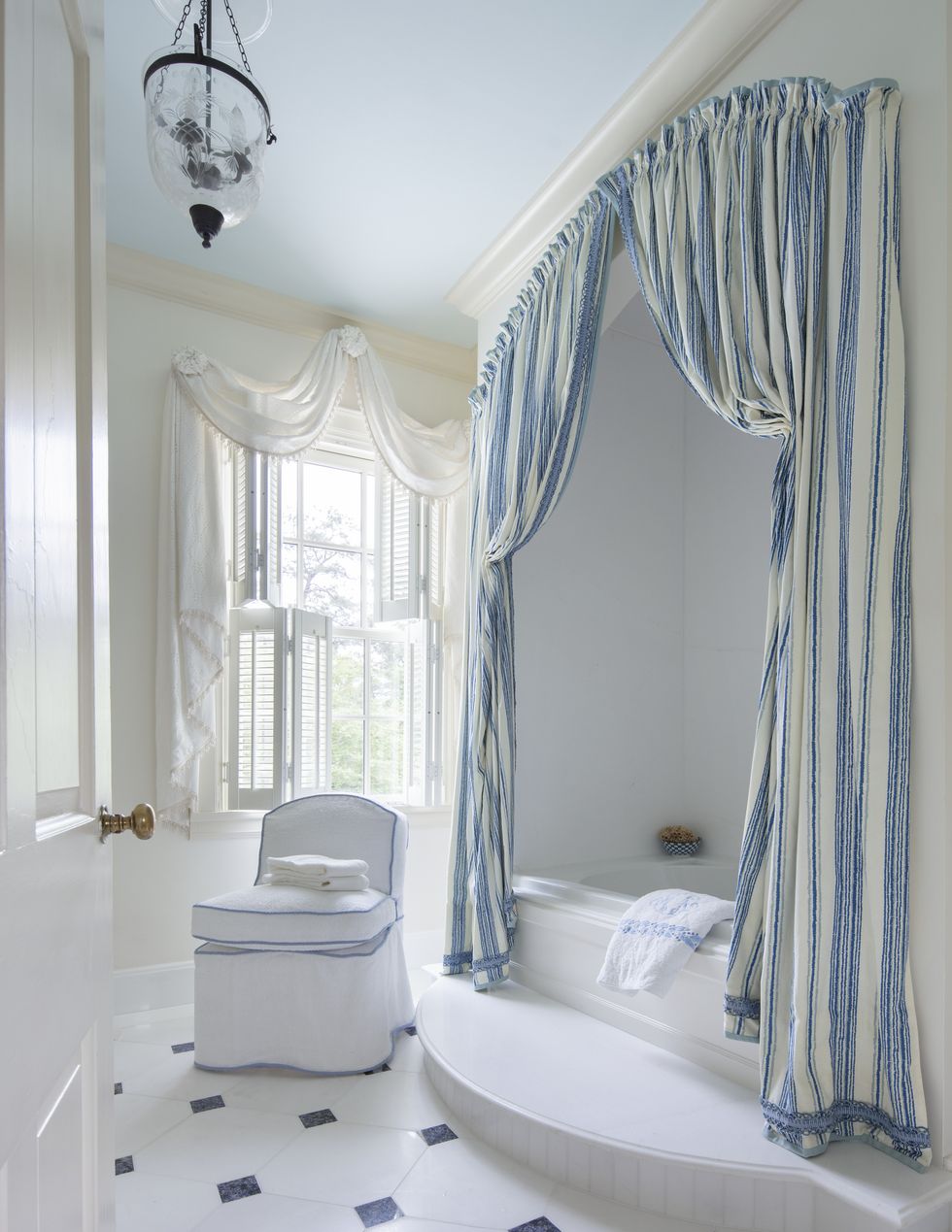 Nhà kiến trức thiết kế Vhome luôn sử dụng rèm ấn tượng như một cách để bổ sung cho các yếu tố kiến trúc trong phòng—kể cả trong phòng tắm ở homestay hay nhà biệt phủ. Các sọc Tillett cổ điển phủ lên bồn tắm của chủ nhân, tạo ra một nơi lý tưởng để nghỉ ngơi và thư giãn.