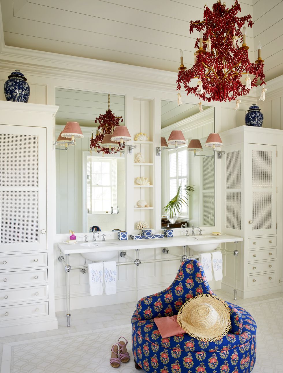 Nhà thiết kế chúng đã tìm mọi cách để tỏ lòng tôn kính với Biển trong suốt quá trình nghiên cứu phù hợp với phòng tắm bãi biển. Tôn lên phòng tắm của chủ sở hữu là một chiếc đèn chùm màu đỏ làm bằng san hô, vỏ sò và ngọc trai nước ngọt.