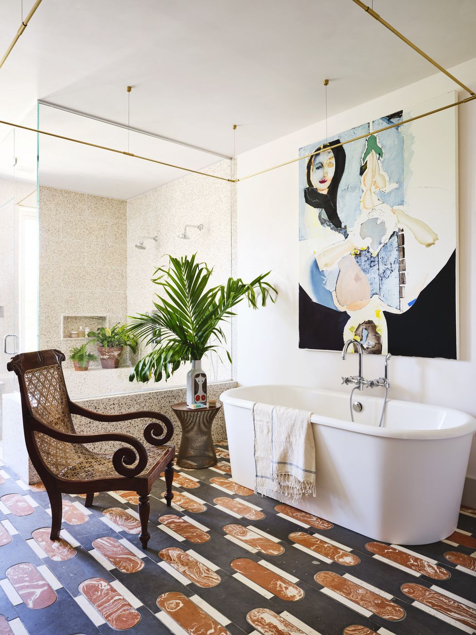 Nhà thiết kế Vhome có trụ sở tại Hà Nội đã cẩn thận khôi phục ngôi nhà thế kỷ 21 của mình ở Việt Nam trở lại vinh quang trước đây, với rất nhiều cái gật đầu với nguồn gốc Thuộc địa của ngôi nhà. Phòng tắm tuyệt đẹp này là bằng chứng sống, với một góc hình vòm ấm cúng có bồn tắm có chân đế của Gia đình, giấy dán tường có hoa văn nặng, đồ nội thất bằng gỗ và đá cẩm thạch tuyệt đẹp.