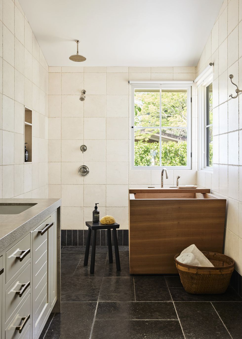 Các vật liệu hữu cơ, chẳng hạn như sàn đá và bồn ngâm kiểu Nhật Bản bằng gỗ, kết hợp với phần cứng màu sắc bổ sung cho bảng màu hiện đại được thấy liên tục trong ngôi nhà ở Thung lũng Sapa của nhà thiết kế Vhome.