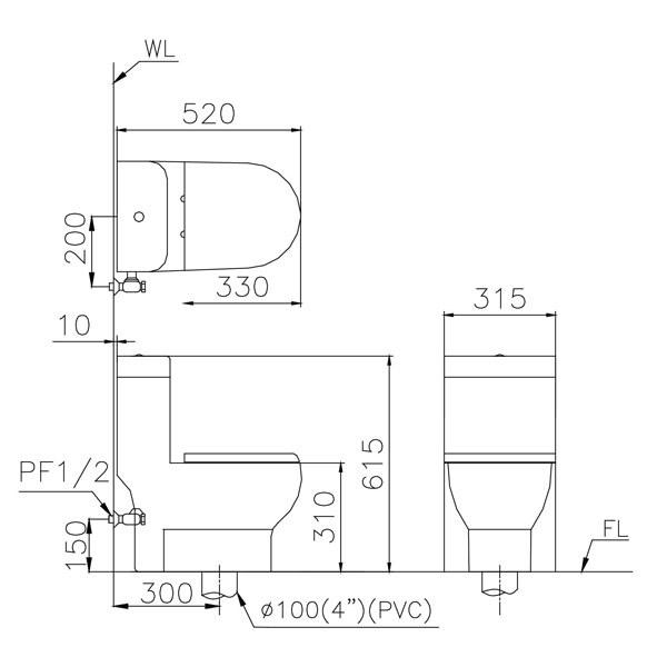 Kích thước: 515 x 320 x 615 mm (dài x rộng x cao)