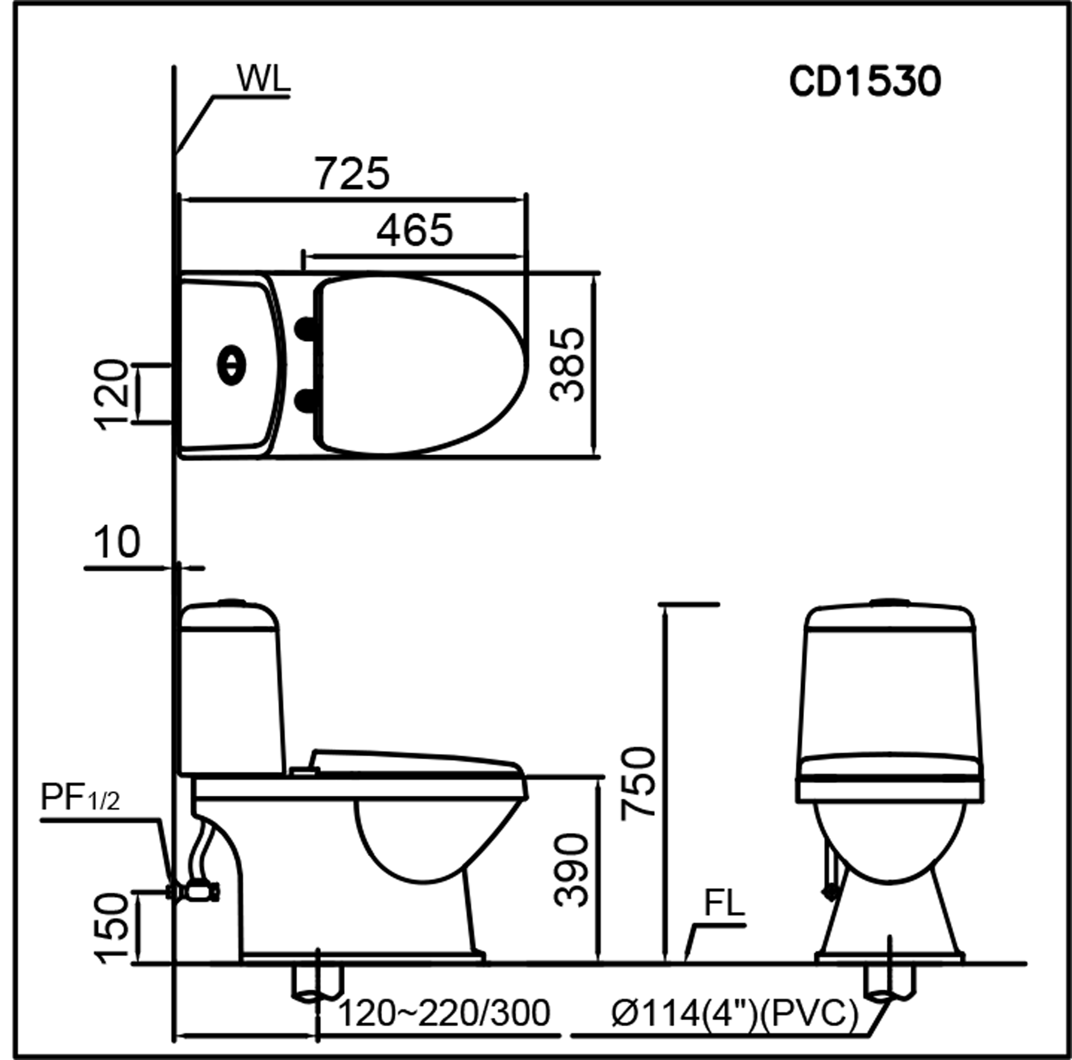 Kích thước: 725 x 385 x 750 mm (dài x rộng x cao)