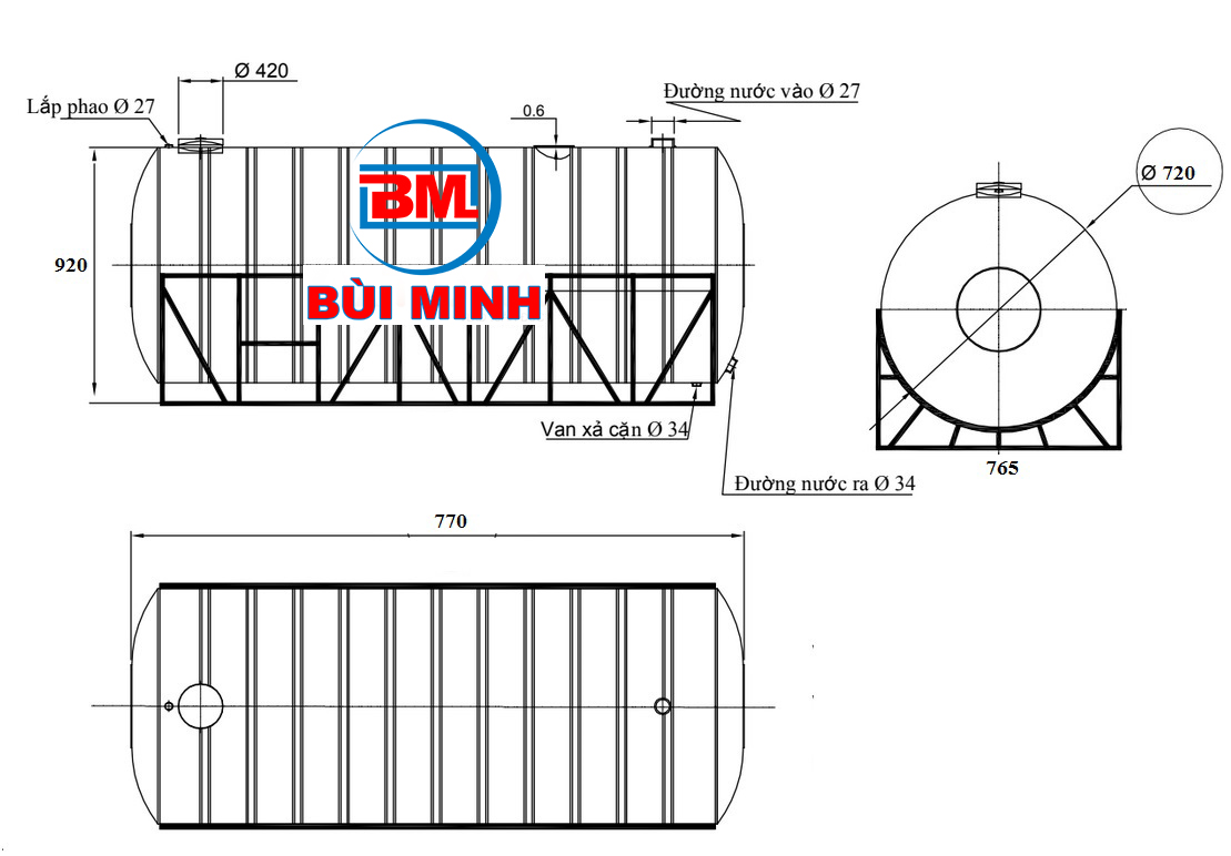 Bản vẽ téc nước inox 300 lít ngang SUS 304 Sơn Hà